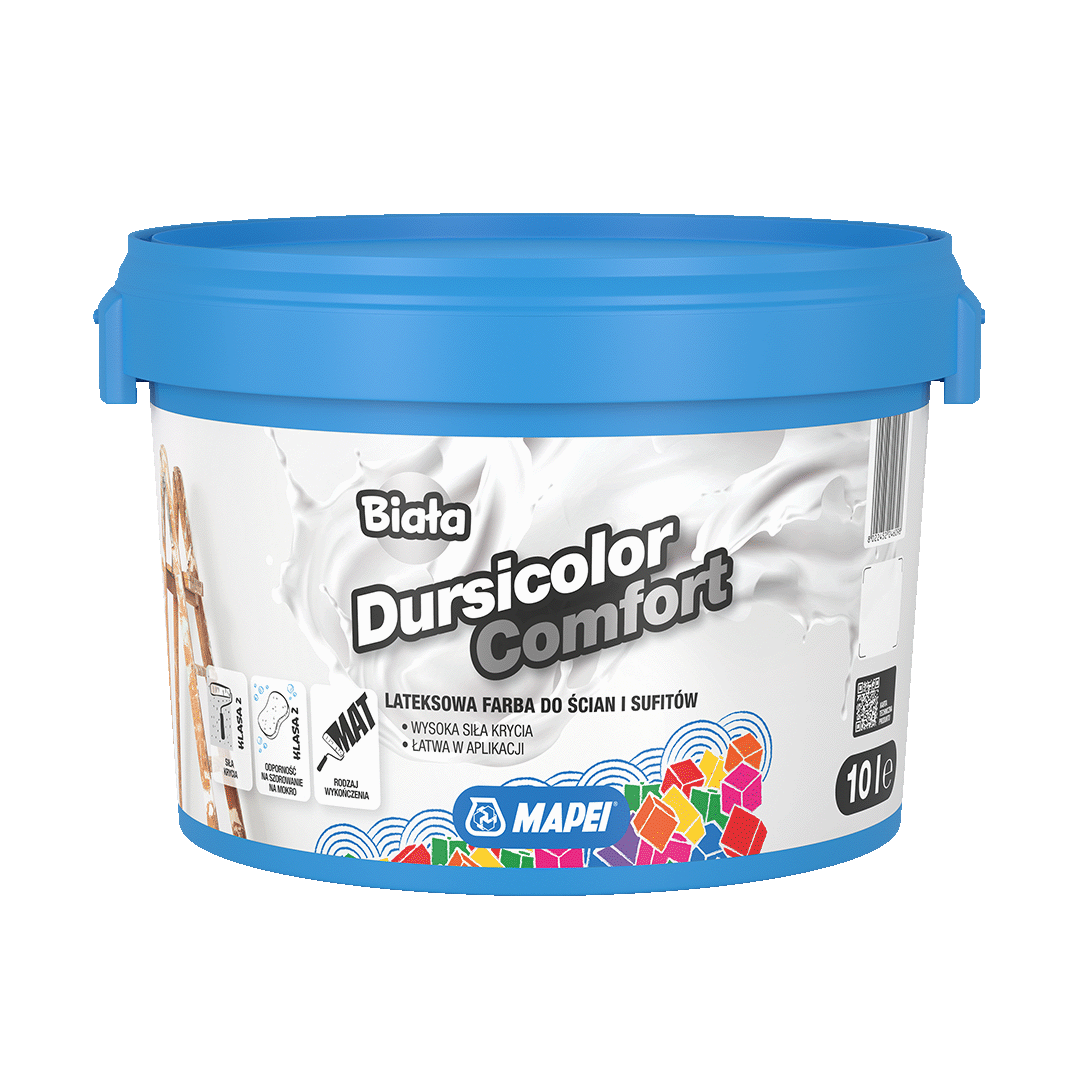 Dursicolor Comfort - lateksowa farba wewnętrzna do ścian i sufitów na bazie wysokiej jakości żywicy akrylowej, o wysokiej sile krycia oraz łatwa w aplikacji.