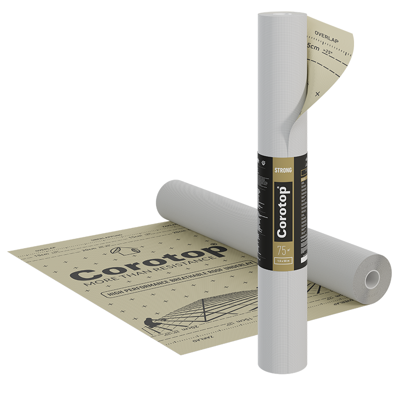Corotop® Strong to wysokiej klasy membrana dachowa o gramaturze 160 g/m², stworzona z myślą o najbardziej wymagających zastosowaniach. Dzięki mocnej, trójwarstwowej strukturze, produkt ten wykazuje ponadprzeciętną odporność na uszkodzenia mechaniczne, przetarcia i rozciąganie, nawet przy dużych obciążeniach. Szczególnie polecana jest na dachy z pełnym deskowaniem, gdzie zapewnia długotrwałą ochronę i stabilność.