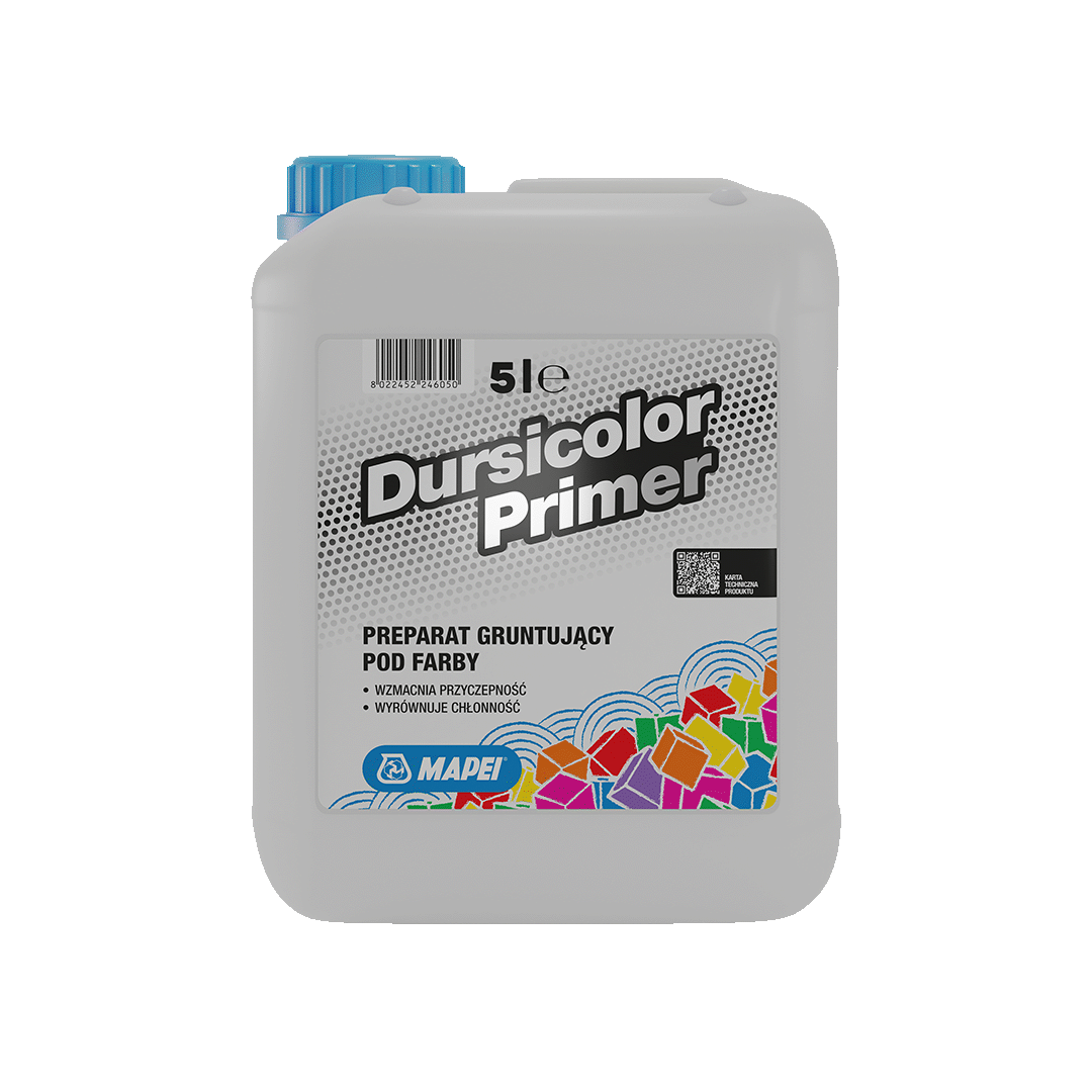 DURSICOLOR PRIMER to gotowy do użycia, gęsty preparat gruntujący, który doskonale wzmacnia przyczepność lekko pylących podłoży oraz wyrównuje ich chłonność. Jego niekapiąca formuła ułatwia aplikację, co czyni go idealnym wyborem przy przygotowywaniu powierzchni mineralnych przed malowaniem. Produkt przeznaczony jest do stosowania wewnątrz pomieszczeń.