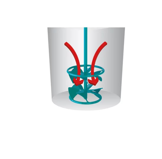 - Specjalna konstrukcja kieruje masę z góry w dół, co umożliwia zanurzanie materiału i zapobiega rozpryskiwaniu oraz tworzeniu się grudek.