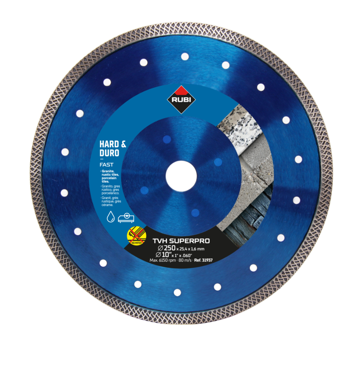 RUBI TVH 250 SUPERPRO 31937 jest tarczą zalecaną do cięcia na mokro twardych materiałów jak granit, gres rustykalny, klinkier, gres porcelanowy, łupki, materiały ogniotrwałe.