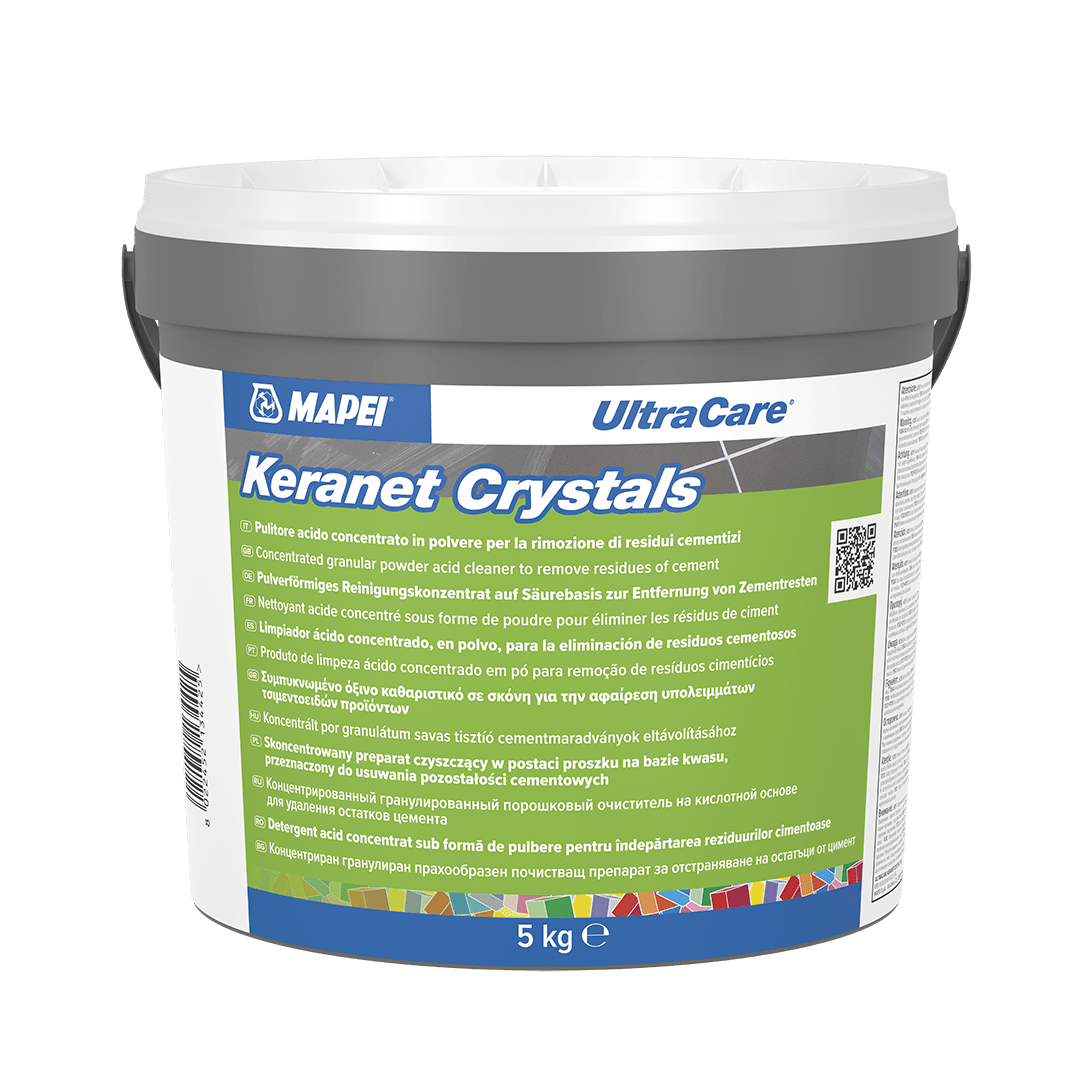 ULTRACARE KERANET CRYSTALS to ultraskuteczny preparat czyszczący na bazie kwasu w formie proszku, który po rozpuszczeniu w wodzie tworzy silny środek do usuwania zabrudzeń cementowych. Jest idealny do zmywania resztek fug, pozostałości cementowych, a także wykwitów solnych i wapiennych z powierzchni płytek