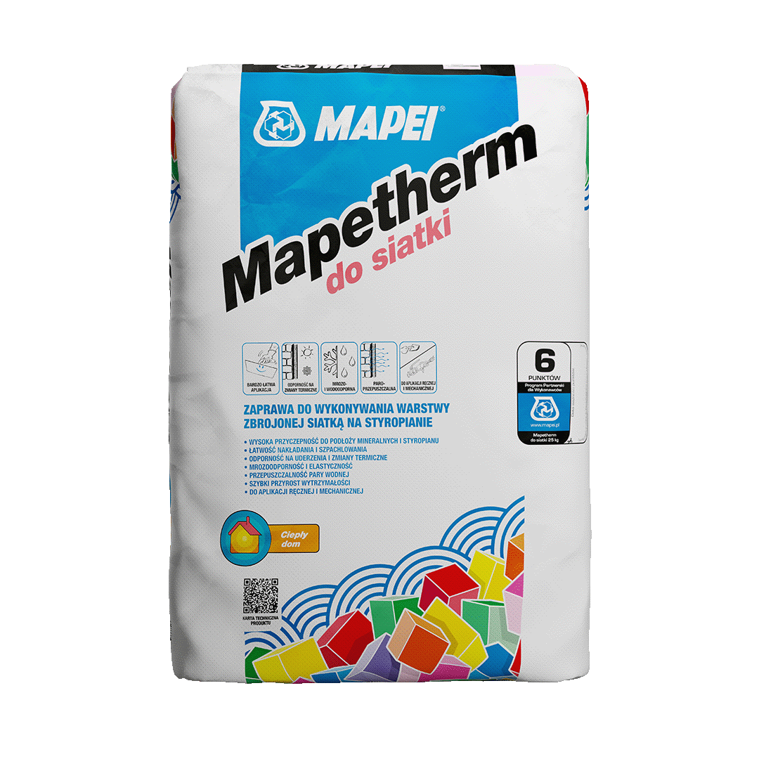 MAPETHERM DO SIATKI to wysokiej jakości zaprawa klejowo-szpachlowa przeznaczona do mocowania płyt styropianowych (białych, grafitowych i w kropki) oraz do zatapiania siatki zbrojącej w systemach ociepleń MAPETHERM. Charakteryzuje się bardzo dobrą przyczepnością, elastycznością i łatwością aplikacji. Przeznaczona do stosowania na zewnątrz budynków.