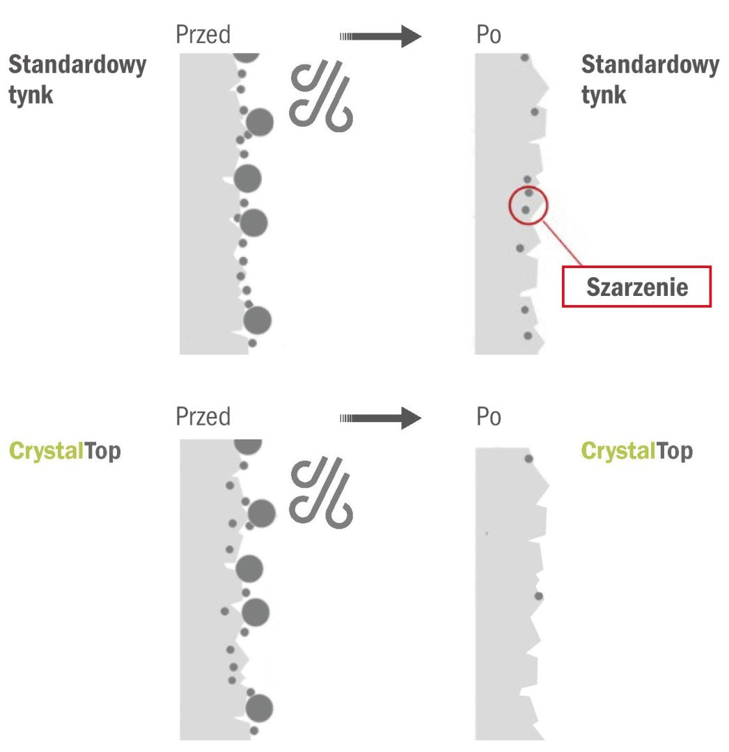Baumit CrystalTop to naturalny, gotowy do użycia tynk Premium, barwiony w masie, cienkowarstwowy, na bazie spoiwa nieorganicznego. Jest to element dwuskładnikowego systemu powłok elewacyjnych, który należy stosować wyłącznie z aktywującym gruntem Baumit CrystalActivator. Dzięki unikalnej technologii Crystal Effect, tynk tworzy trwałą, naturalną i oddychającą powierzchnię, która charakteryzuje się wyjątkową odpornością na zabrudzenia. Produkt zapewnia ochronę przed grzybami, glonami i pleśnią, co czyni go idealnym wyborem w systemach ociepleń Baumit.