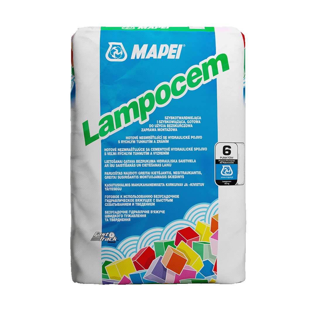 Lampocem – błyskawiczny cement montażowy, gotowy do użycia. To bezskurczowa, szybkoschnąca mieszanka cementowa, która wiąże w zaledwie 3 minuty przy temperaturze +20°C. Idealny do montażu i osadzania różnorodnych elementów, dzięki plastycznej konsystencji i właściwościom tiksotropowym, zapewnia łatwość aplikacji oraz szybki przyrost wytrzymałości mechanicznej. Nie zawiera chlorków, co eliminuje ryzyko korozji stalowych elementów montażowych.